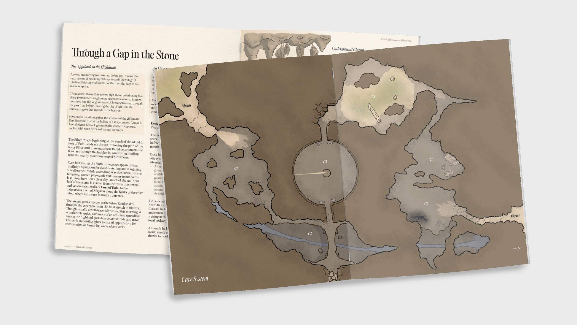 Following the banks of the River Filna, towering escarpments line the Silver Road as it climbs into the highlands. The village of Blufftop sits perched atop the rim, renowned for its panorama vista of the southern sky and the land that sweeps out below it. The tiered outcrops below, however, are ancient and karst, and hold their own secrets: what mysteries lurk within?